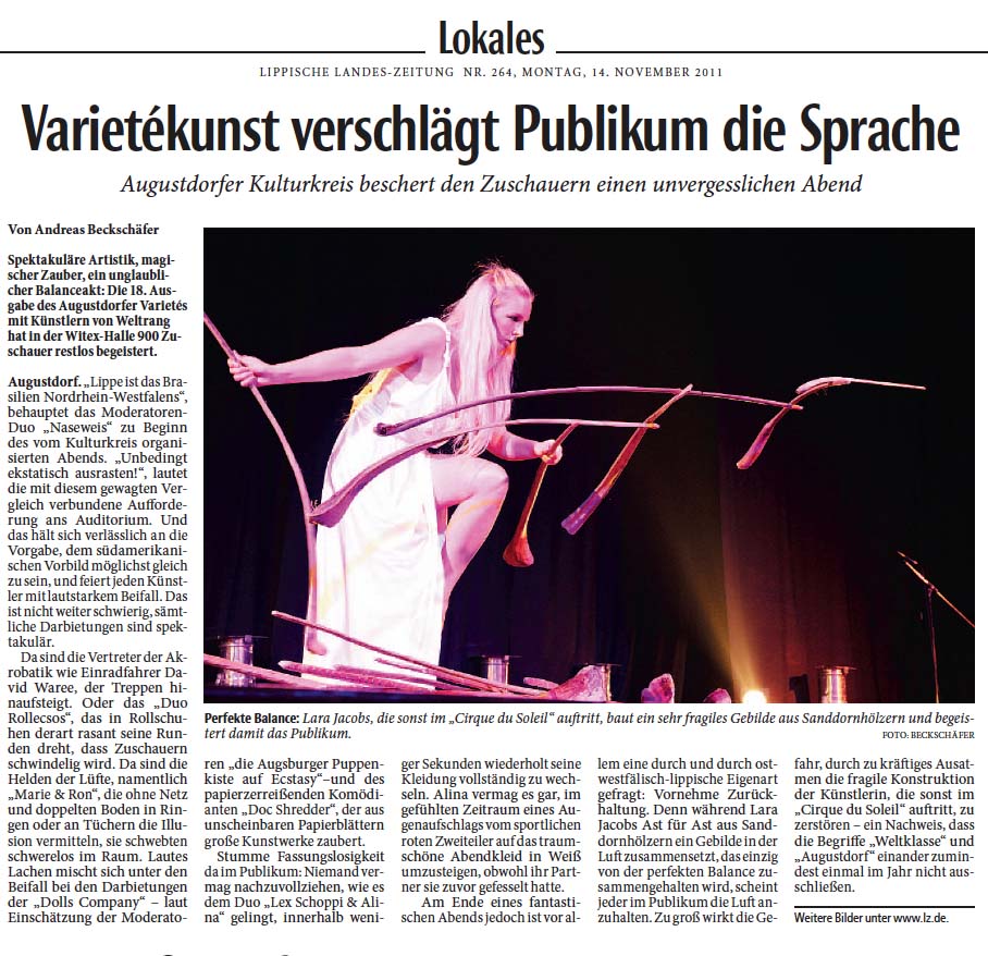Lex Schoppi & Alina hatten die große Ehre, am 12.November 2011 im Augustdorfer Varieté ihre neue Quick Change Show zu zeigen. Sogar das TV (ARD) reiste an, um über die Varietéshow zu berichten. Für das TV Team spielten Lex Schoppi & Alina in der Probe ihre Darbietung, was im TV Bericht auch gesendet wurde.