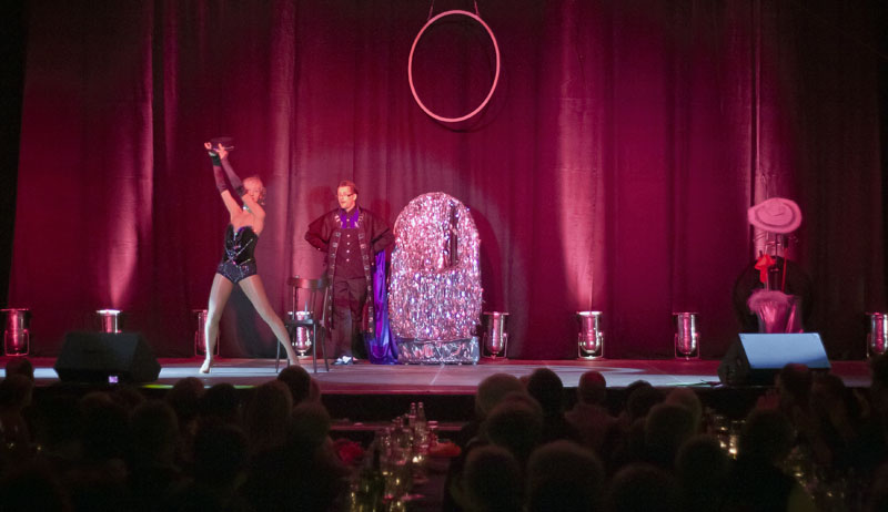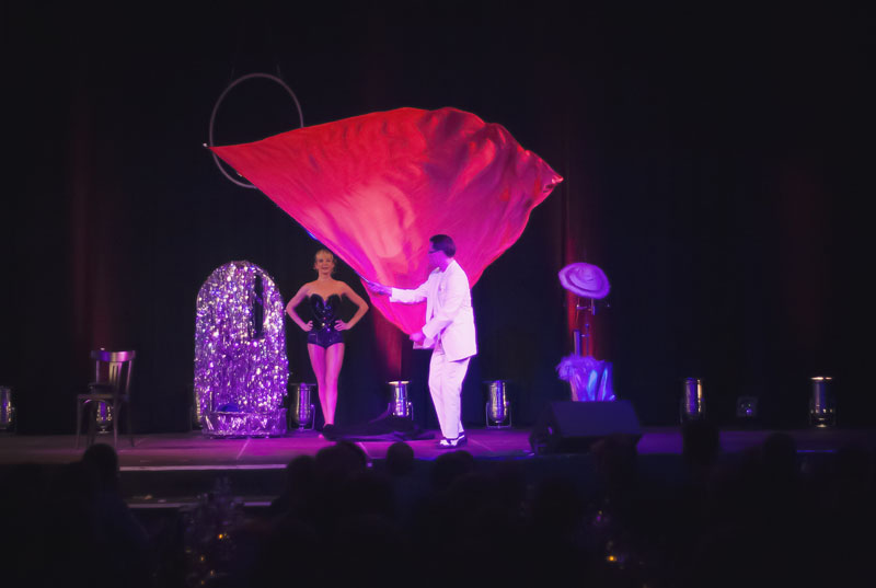 Als eines der Highlights verpasste die Quick-Change Illusionsnummer von Lex & Alina dem Namen “Kurzweiligkeit” eine neue Definition. Anwesende Damen waren verblüfft und die Herren sichtlich amüsiert, als Künstlerin Alina selbst unter der Fessel ihre Showgarderobe wechselte. Im Feuerwerk der unzähligen Sekunden – Kleiderwechsel, mehrfach sogar mitten im Saal, hatten die Fotografen wahrhaft Mühe, den Beiden zu folgen. Die umringt vorgeführten Illusionen direkt vor der Nase des Publikums ganz ohne Bühne und doppelten Boden waren noch lange das Gesprächsthema an diesem Abend und blieben lange in Erinnerung. Spätestens bei der Kleiderfrage für die nächste Gala versuchen Mann oder Frau sich mit der Illusion des schnellen Kleiderwechselns zu arrangieren. Insofern projizierten die beiden Verwandlungskünstler Lex und Alina eine bleibende Vision mit Erinnerungspotenzial.