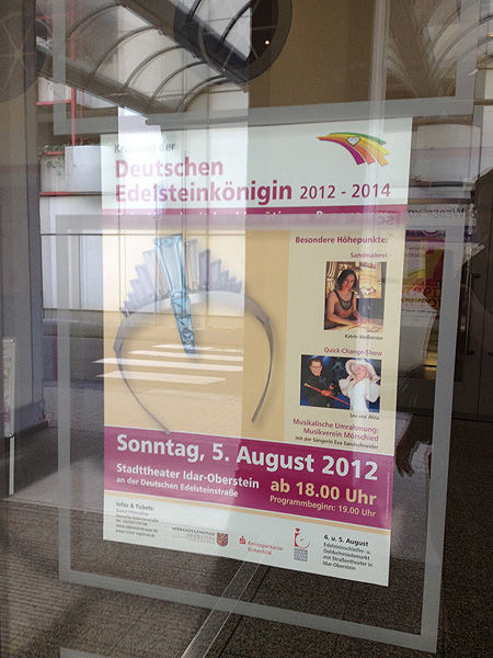 Idar Oberstein:Anlässlich der Krönungszeremonie der Deutschen Edelsteinkönigin fand im Stadttheater Idar Oberstein eine öffentliche Gala statt. Die Lex & Alina Show wurde für das Showprogramm gebucht und begeisterte das Publikum. Unmittelbar danach kam es zur Zeremonie. In einem Traum von Mint betrat Magdalena Meng, die neue Edelsteinkönigin, ihren Thron. Als Edelsteinkönigin präsentiert sie die Region und Wirtschaft der Deutschen Edelsteinstraße.