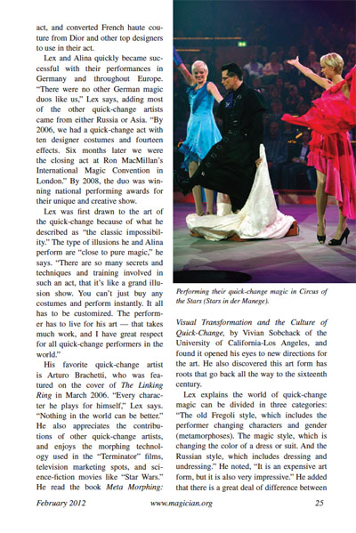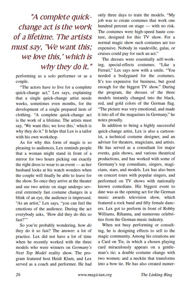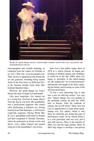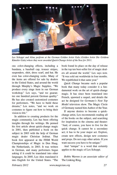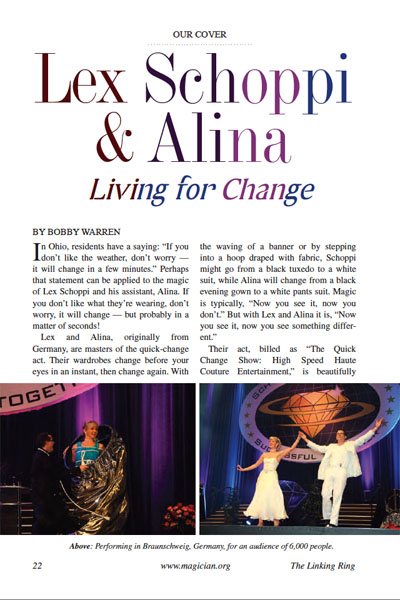 USA: Die I.B.M. (International Brotherhood of Magicians) veröffentlichte in der Februarausgabe ihrer Zeitschrift „the linking ring“ eine Coverstory über das aus Deutschland stammende Magierduo Lex Schoppi & Alina. Im Editorial der Onlineausgabe schreibt ‚the linking ring‘: „this couple has grown into one of the top quick change acts in the world.“ Das 6-seitige Portrait mit Interview tituliert unter der Headline „living for change“ und wurde verfasst vom Redakteur Bobby Warren.